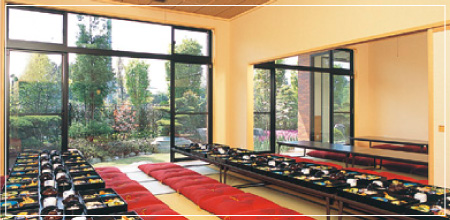 ご法要のための法事室、会食室は、満室になることがございます。おおよその人数が決まりましたら霊園受付、043-461-7448 までお早めにご相談ください。